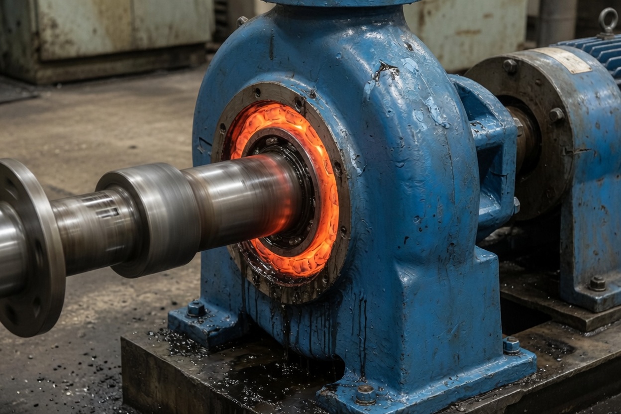 Increased noise or heat at the bearing housing, visible shaft play, vibration increase, or complete shaft seizure.